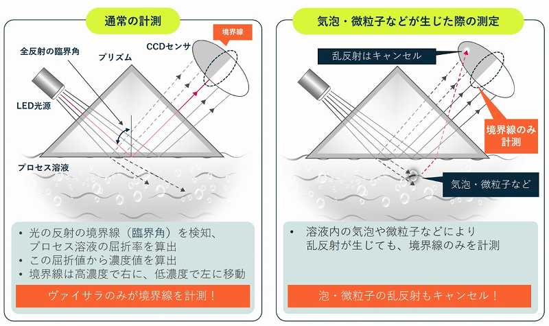 溶液内の気泡や微粒子などにより、乱反射が生じても、境界線のみを計測します。