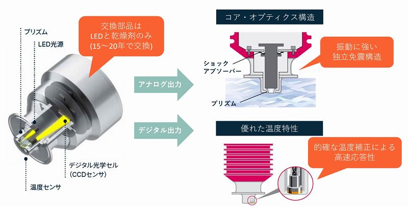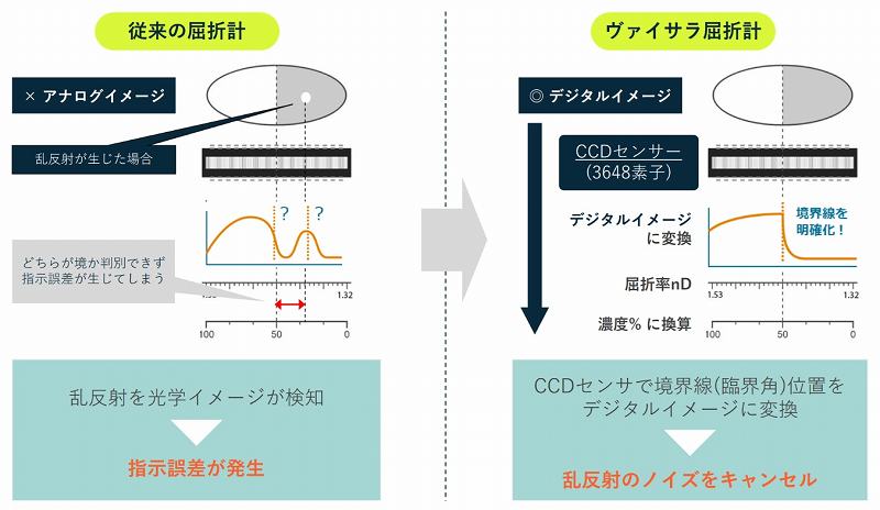 CCDセンサで境界線(臨界角)位置をデジタルイメージに変換。乱反射のノイズをキャンセルします。